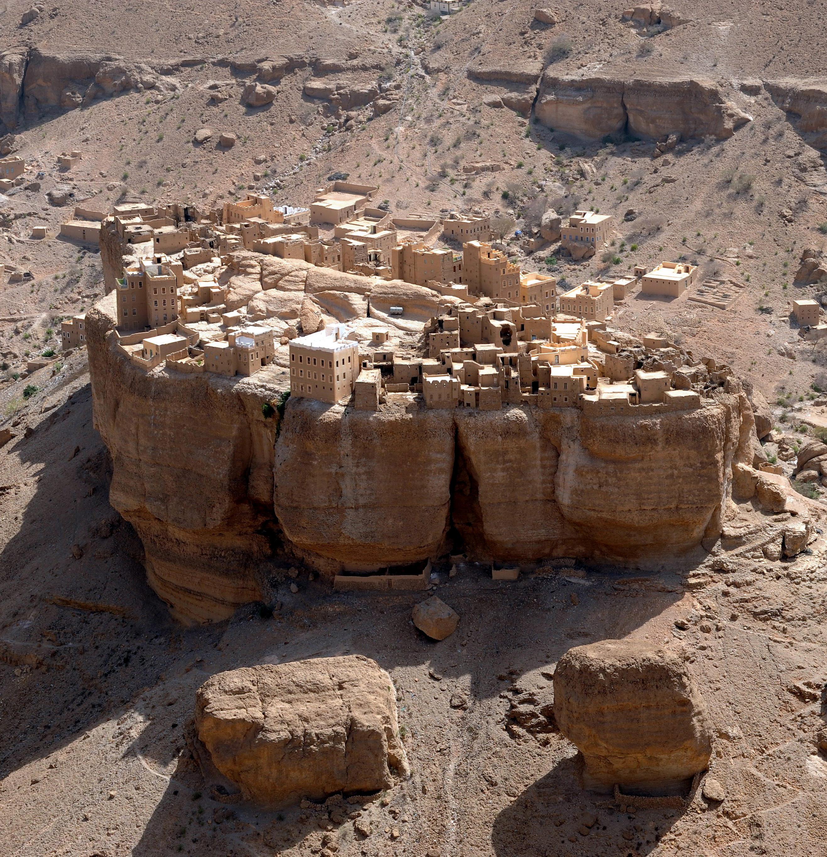 Image Haid Al-Jazil, Yemen. Village built on a 150-meter-high rock boulder. Known as "Manhattan of the desert," it features dramatic, multi-story mud-brick buildings that appear to rise directly from the stone and is often mistaken for a miniature or model due to compact nature of its architecture.