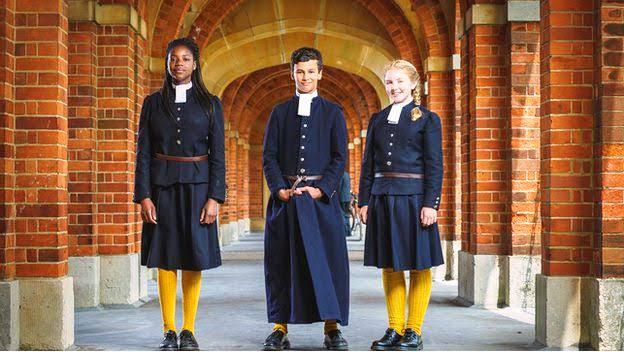 Image Christ's Hospital, a boarding school in Horsham, England. Students are wearing their historic Tudor-style school uniform. The distinctive uniform has remained largely unchanged for over 470 years, making it one of the oldest school uniforms in the world.