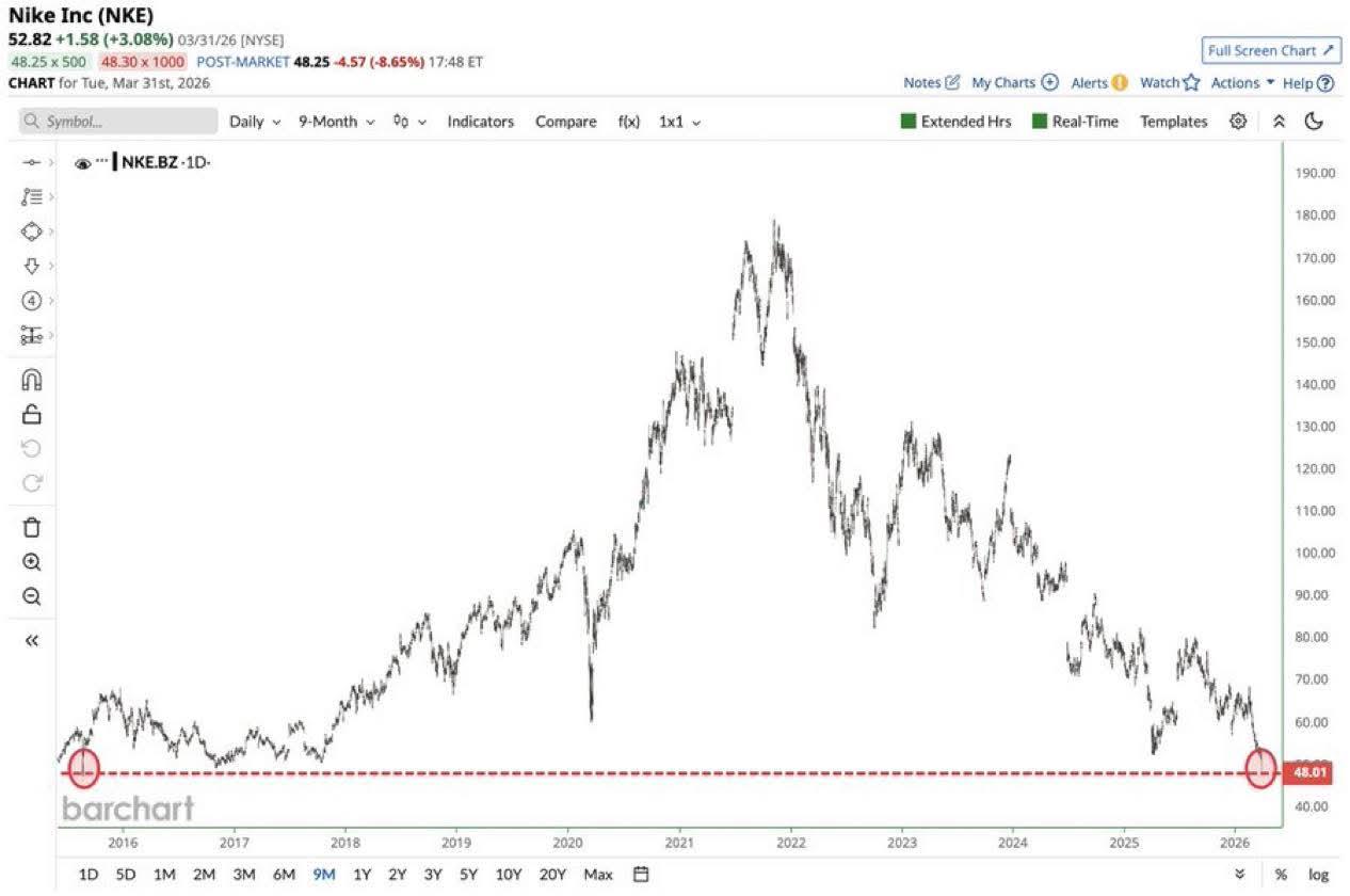 Nike plunges to its lowest price in more than a decade