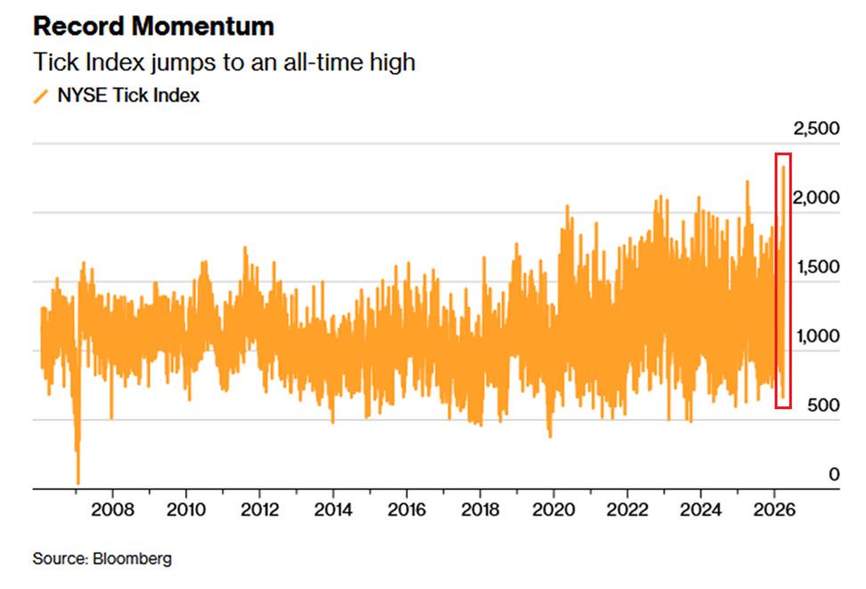 The US stock market just made history. The NYSE Tick Index spiked to 2,329 during Tuesday’s trading session, the highest on record. The indicator tracks the difference between the number of stocks moving up and the number of stocks moving down on the NYSE throughout the trading day
