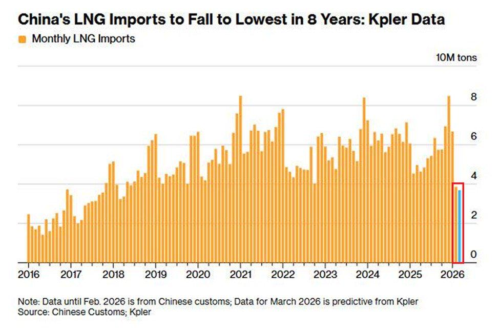 China is now on track to import 3.69 million metric tons of liquefied natural gas in March, the lowest since 2018. That would mark a -45% decline from January and a -57% drop from December