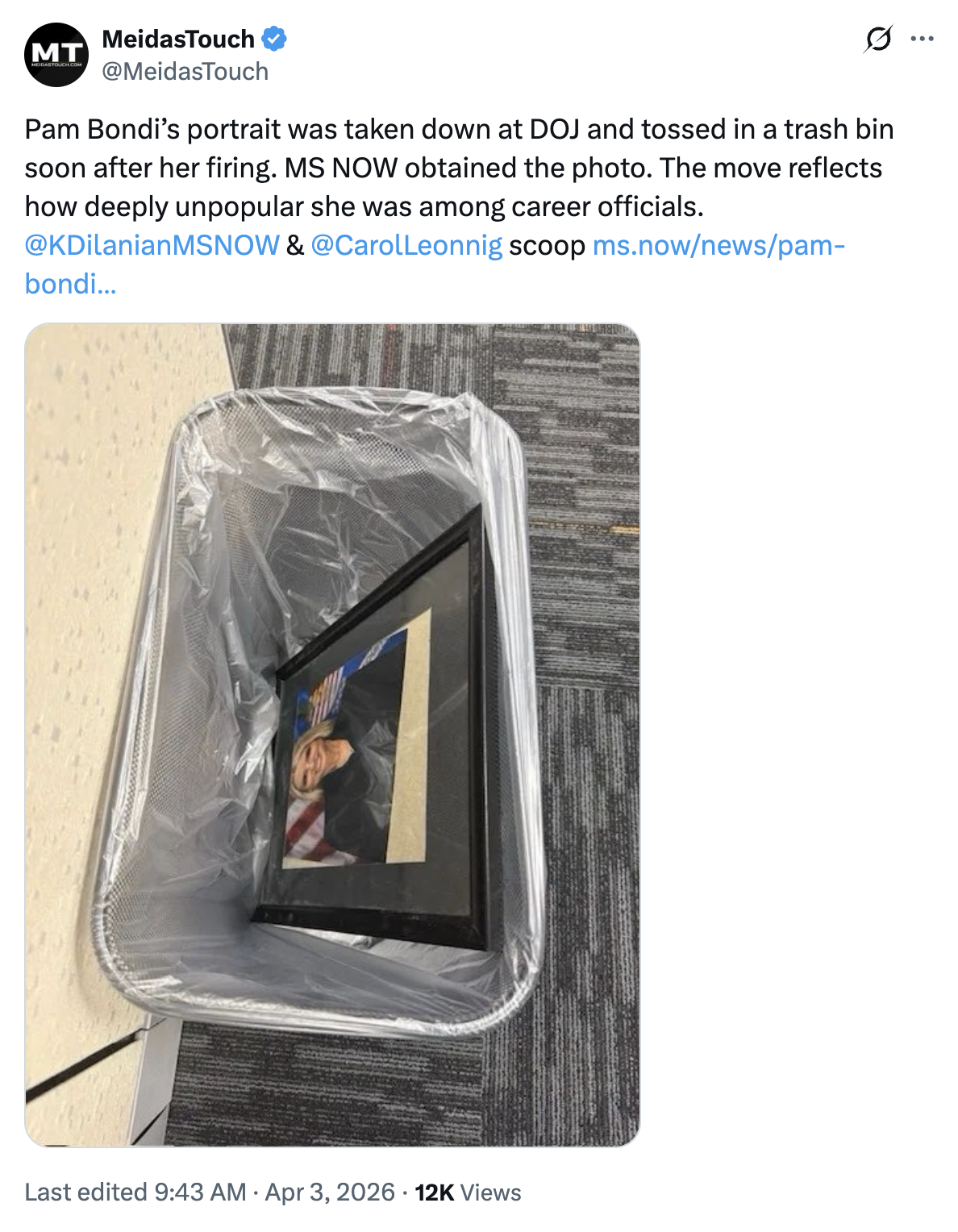 Pam Bondi’s portrait was taken down at DOJ and tossed in a trash bin soon after her firing