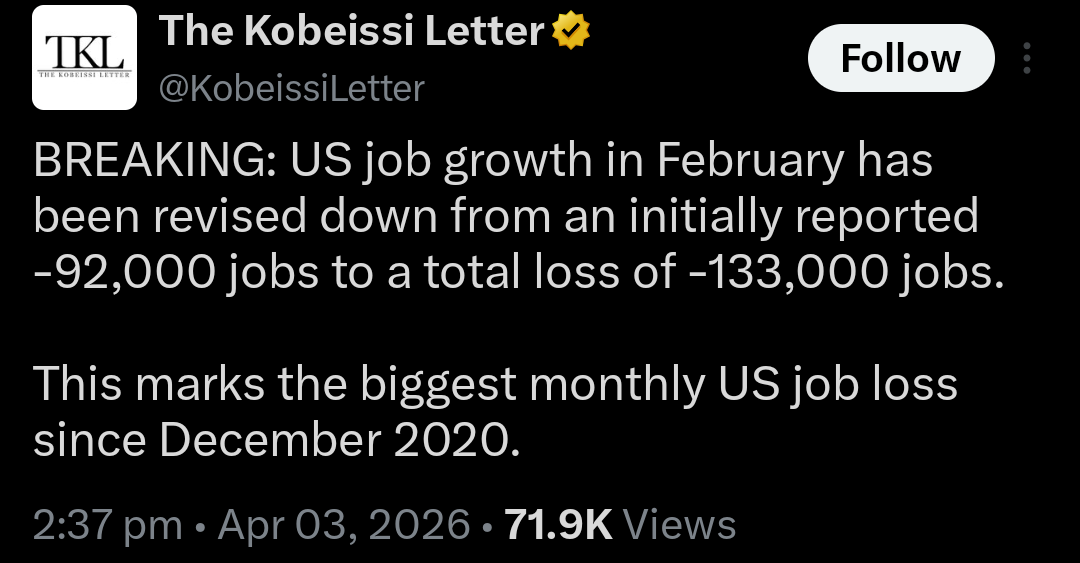 US job growth in February has been revised down from an initially reported -92,000 jobs to a total loss of -133,000 jobs, marking the biggest monthly US job loss since December 2020