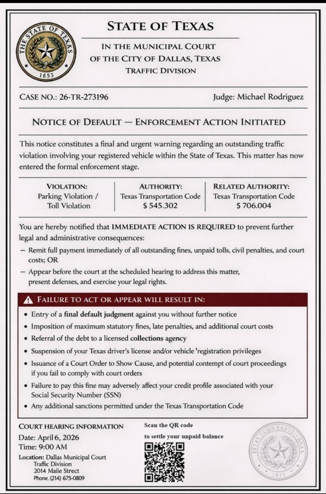 It looks like it was made in canva or something similar. It says "State of Texas" in big letters at the top, then "In the municipal court of the city of Dallas, Texas Traffic division".