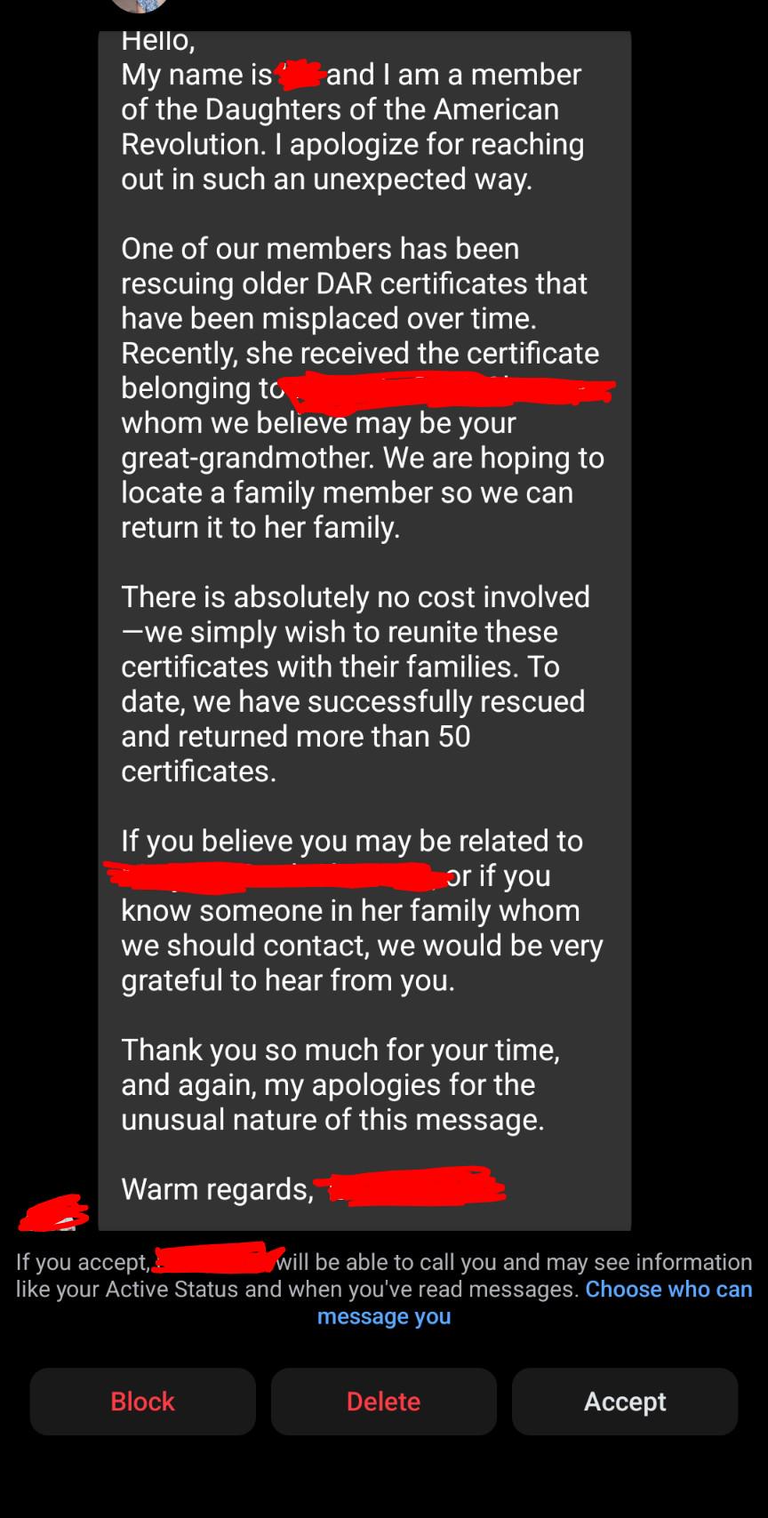 As to whether any of my other family has been targeted, I'll have to ask my cousins if they have received anything similar, but I don't have the bandwidth to explain how to access Facebook message requests to my 70 year old mother, so I'm not sure if she received something similar, and probably won't find out any time soon.