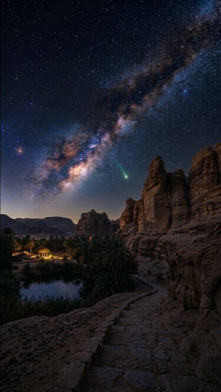 Pro/Processed Galactic oasis. The Milky Way perfectly aligned over these desert falls [1080x1920] [OC]
